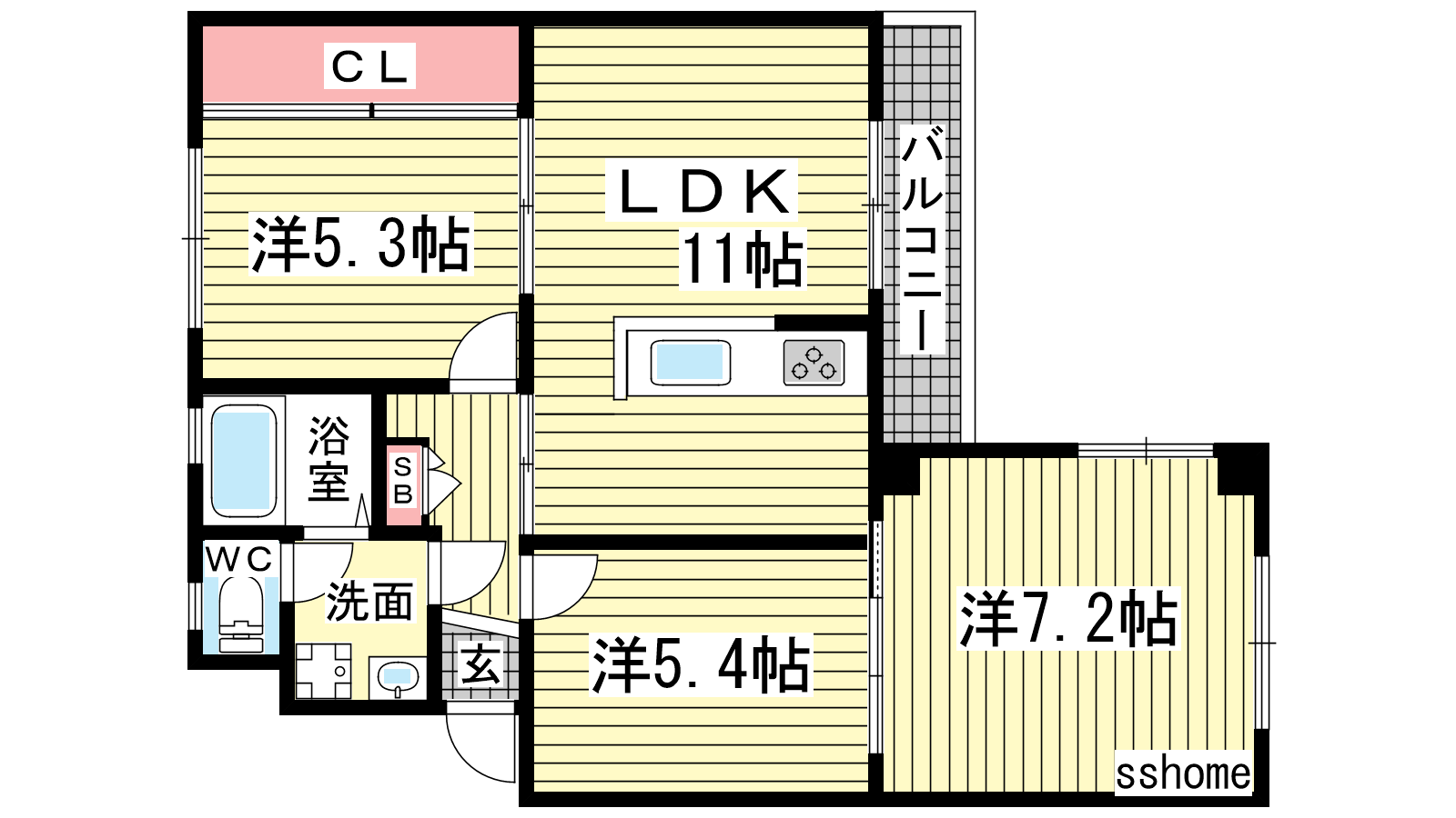 - LDK11帖、洋室7.2帖、洋室5.4帖、洋室5.3帖