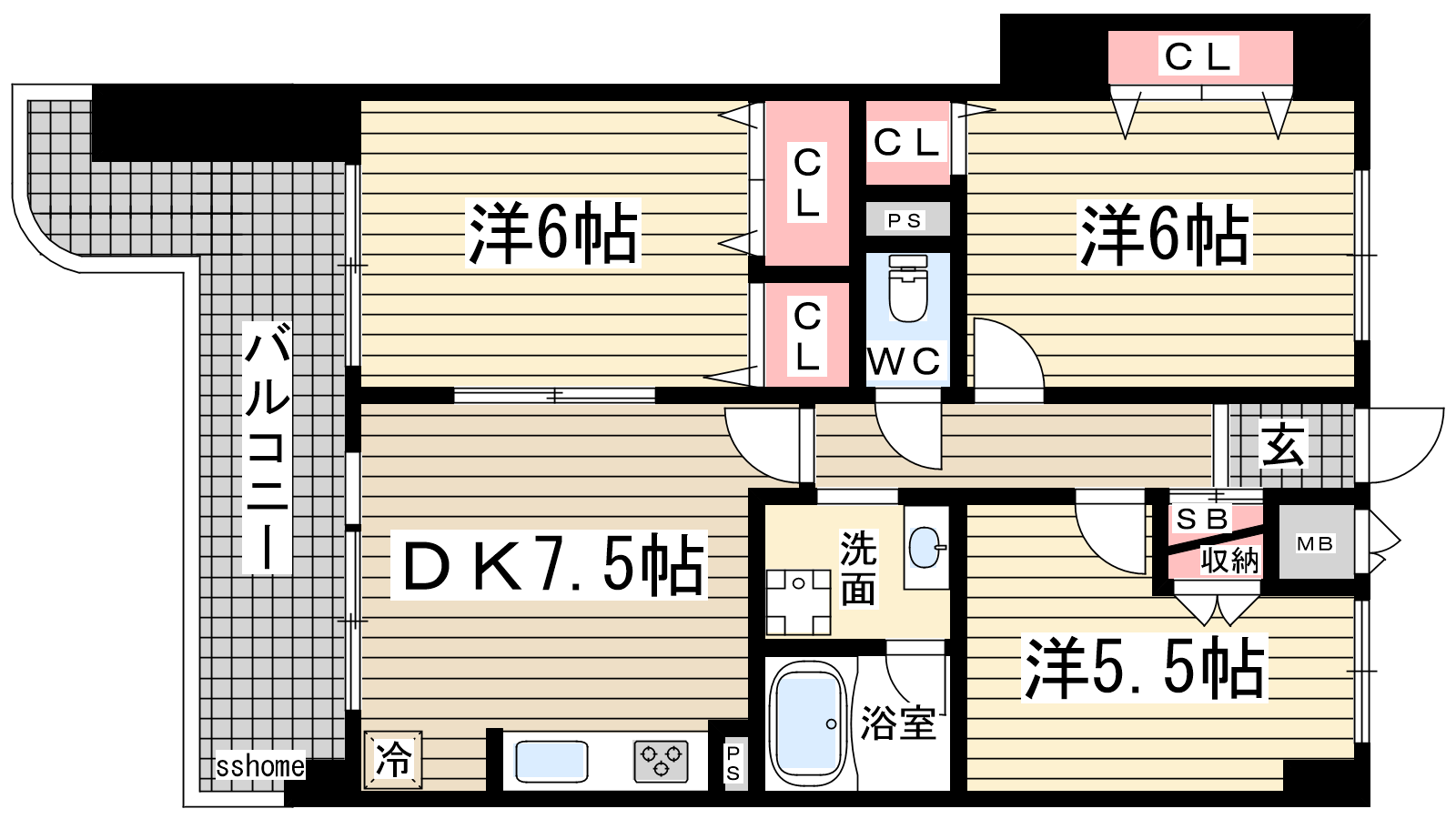- DK7.5帖、洋室6帖、洋室6帖、洋室5.2帖