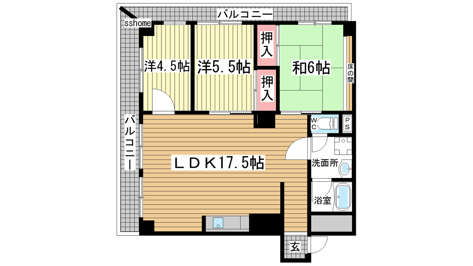 - LDK17.5帖、洋室4.5帖、洋室5.5帖、和室6帖