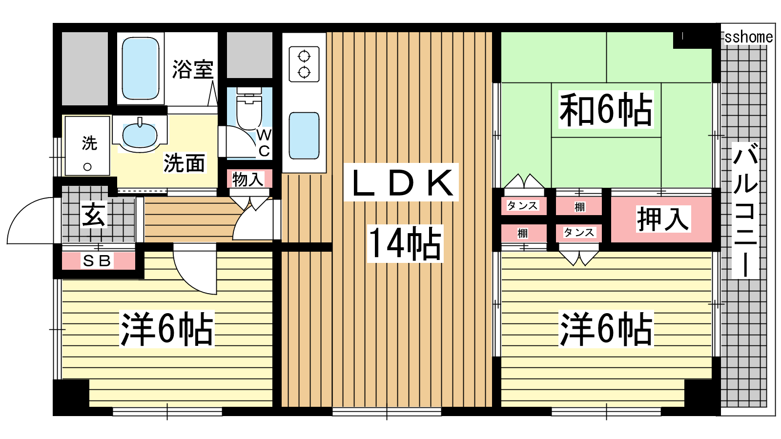 - LDK14帖、洋室6帖、和室6帖、洋室6帖