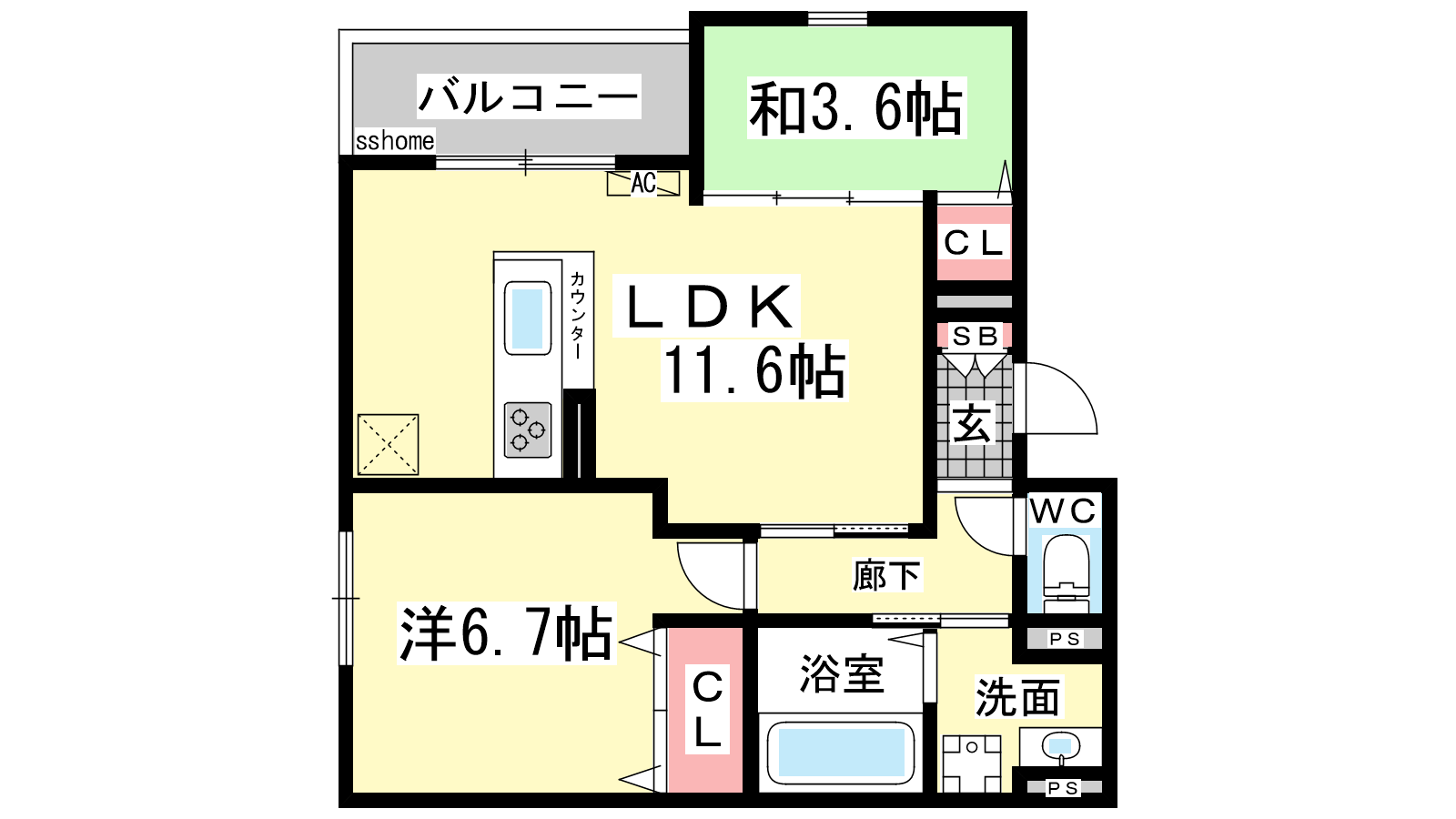 - LDK11.6帖、洋室6.7帖、和室3.6帖