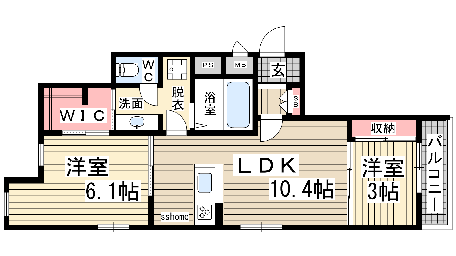 - LDK10.4帖、洋室3帖、洋室6.1帖