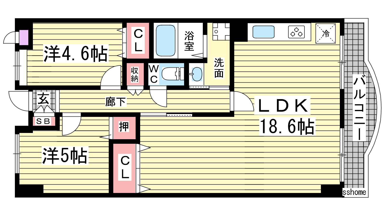 - LDK18.6帖、洋室5帖、洋室4.6帖