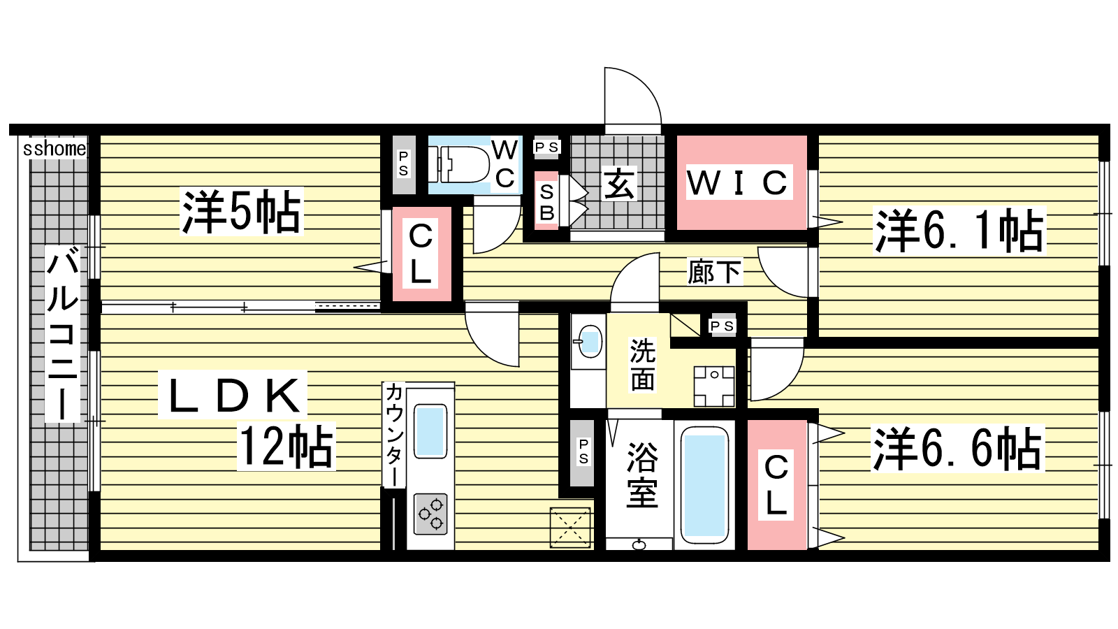 - LDK12帖、洋室6.6帖、洋室6.1帖、洋室5帖