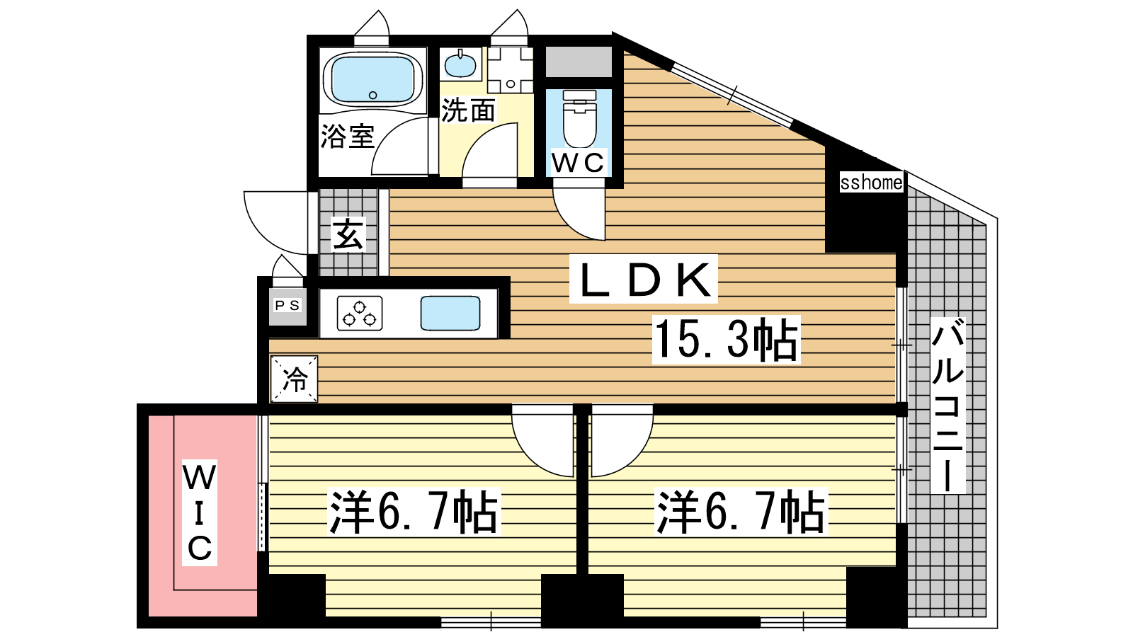 - LDK15.3帖、洋室6.7帖、洋室6.7帖