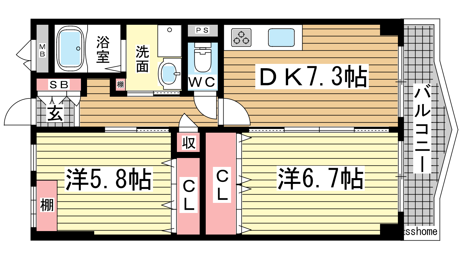 - 洋室6.7帖、洋室5.8帖、DK7.3帖