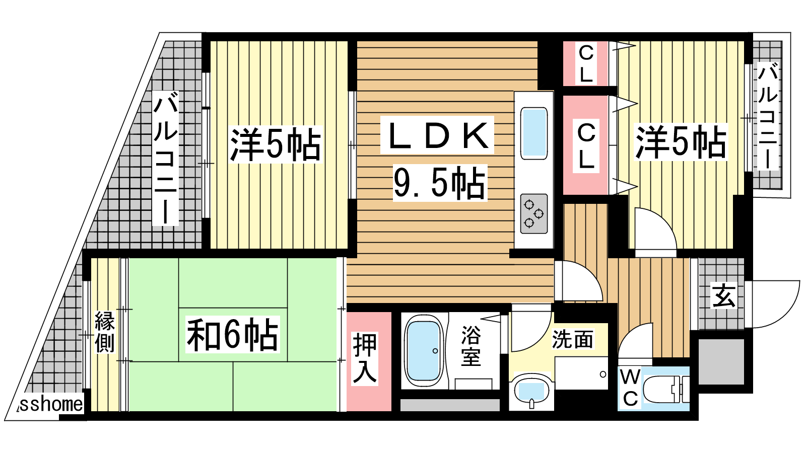 - LDK9.5帖、和室6帖、洋室5帖、洋室5帖
