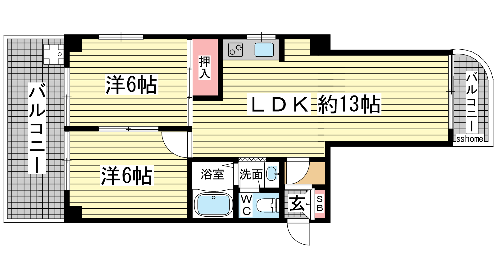 - 洋室6帖、LDK13帖、和室6帖