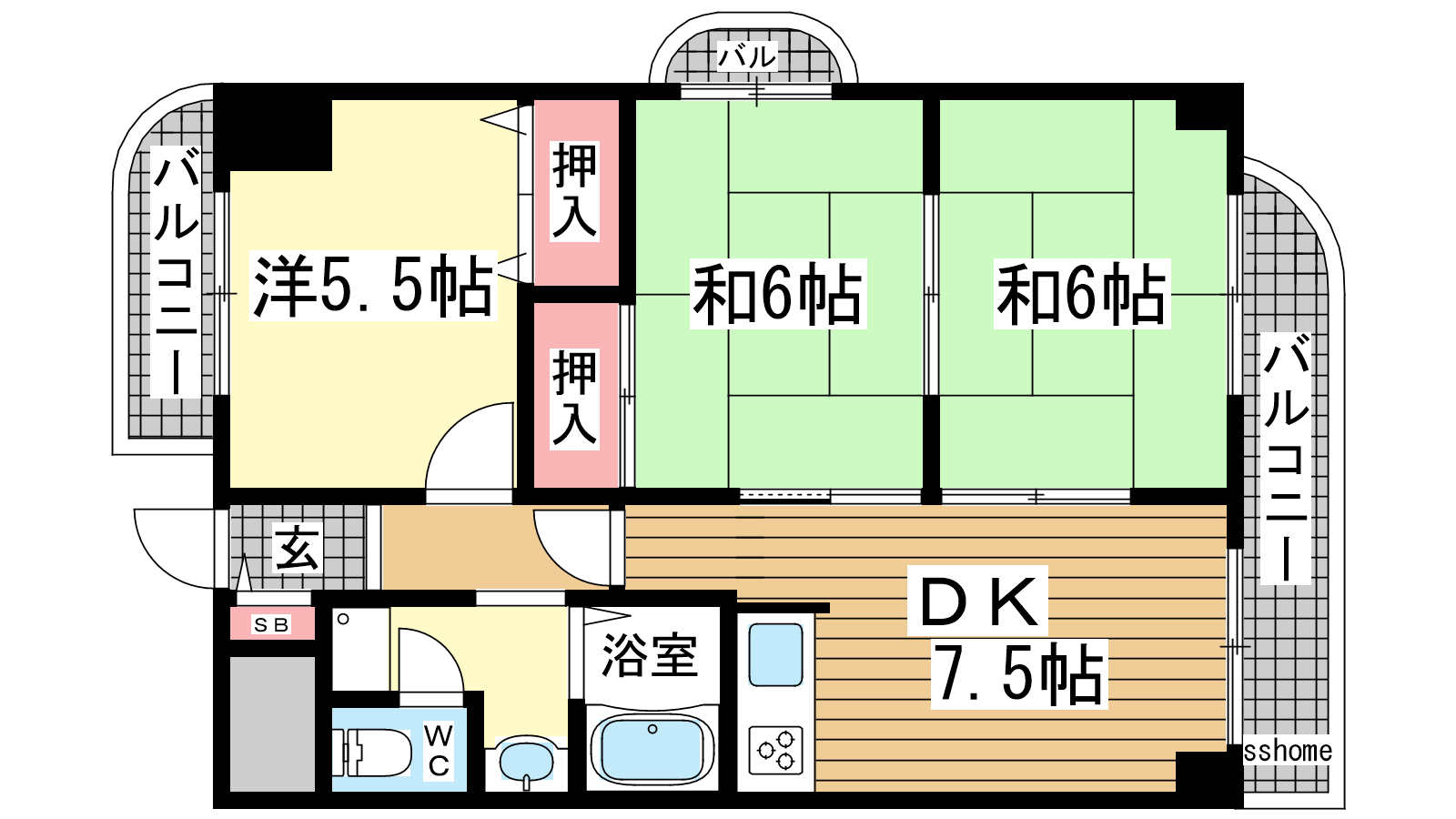 - DK7.5帖、洋室5.5帖、和室6帖、和室6帖
