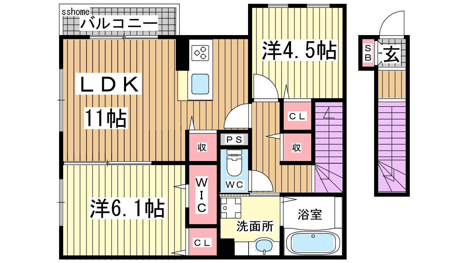- LDK11帖、洋室6.1帖、洋室4.5帖