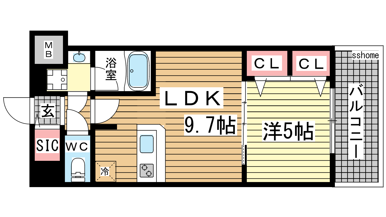 - LDK9.7帖、洋室5帖