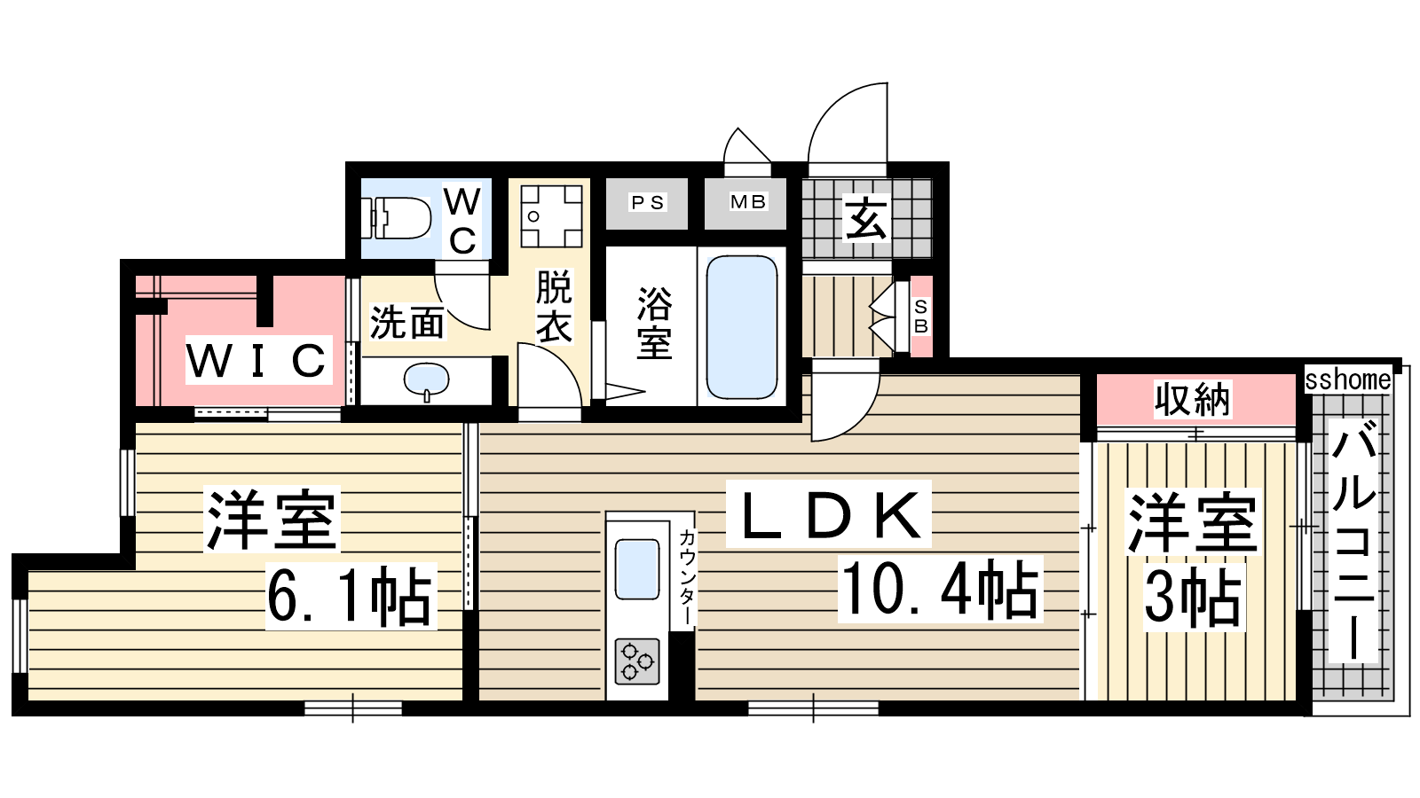 - LDK10.4帖、洋室3帖、洋室6.1帖