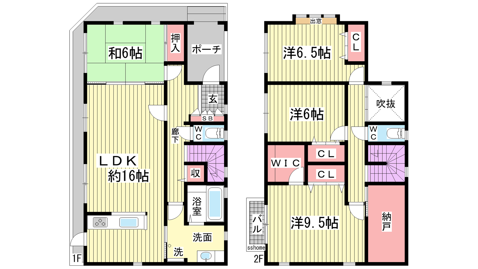 - LDK16帖、洋室9.5帖、洋室6.5帖、洋室6帖、和室6帖、S4帖