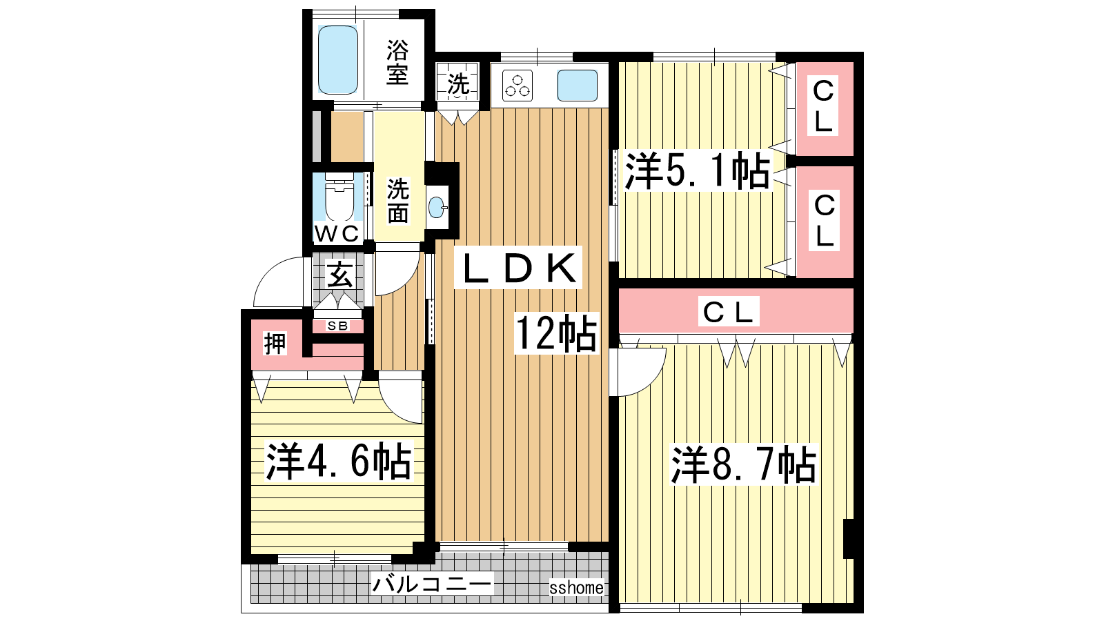 - LDK12帖、洋室8.7帖、洋室5.1帖、洋室4.6帖