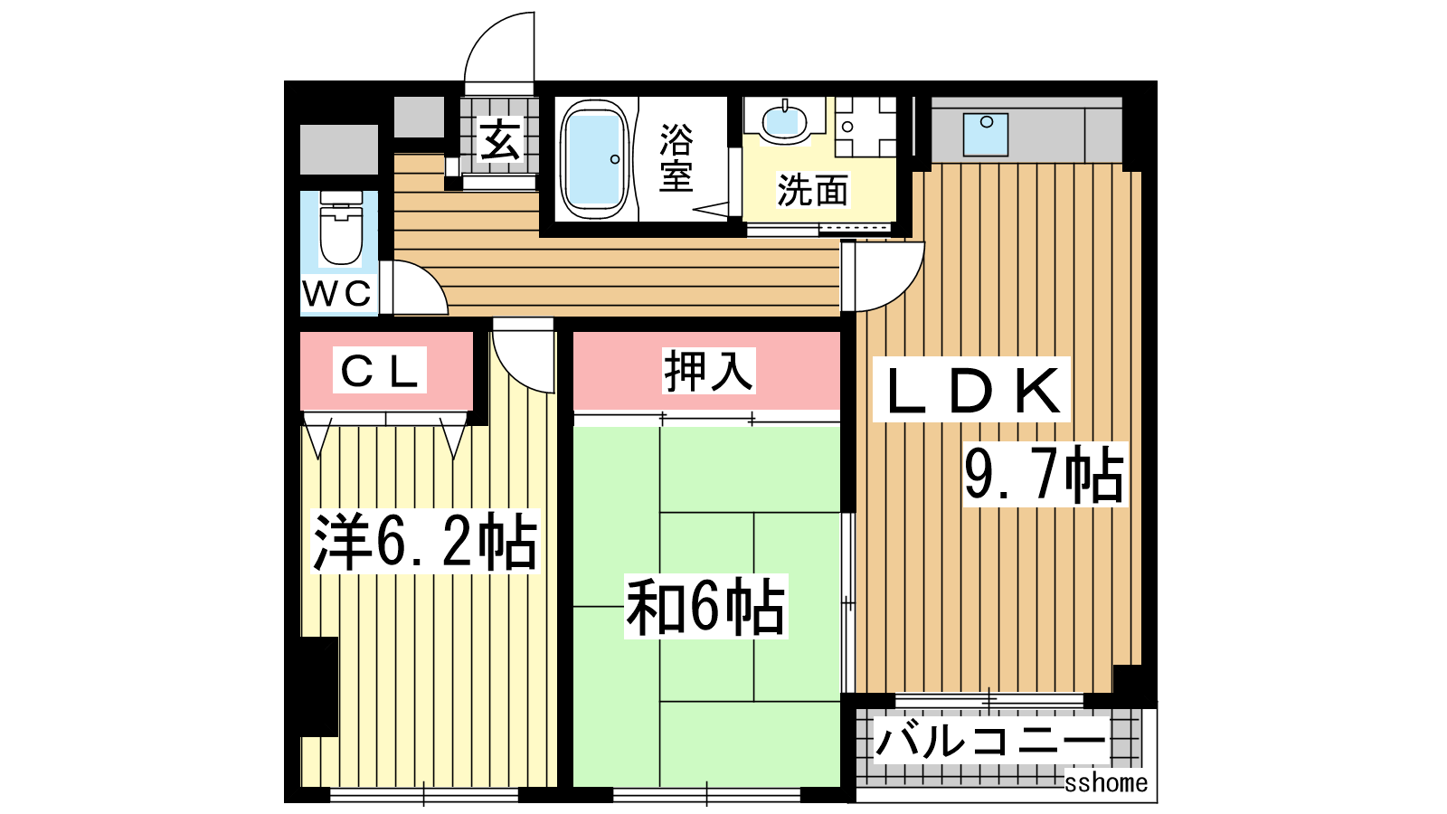 - LDK9.7帖、洋室6.2帖、和室6帖