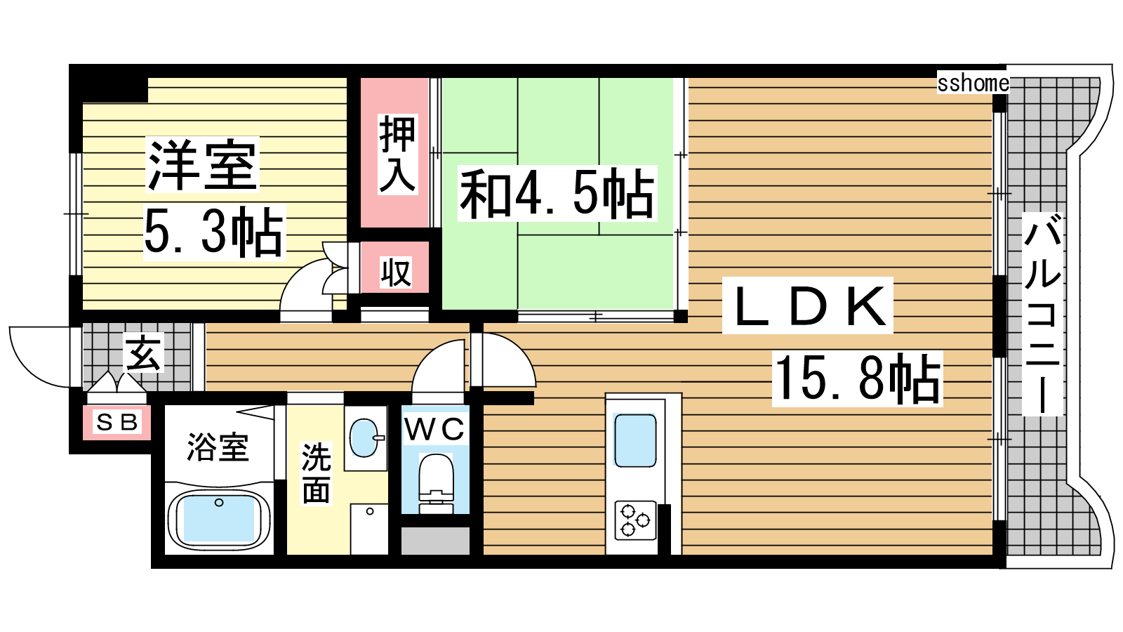 - LDK15.8帖、洋室5.3帖、和室4.5帖