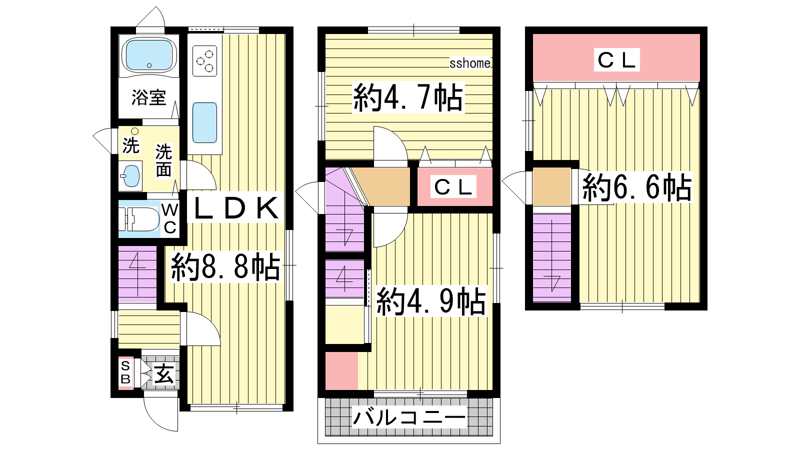 - LDK8.8帖、洋室6.6帖、洋室4.9帖、洋室4.7帖