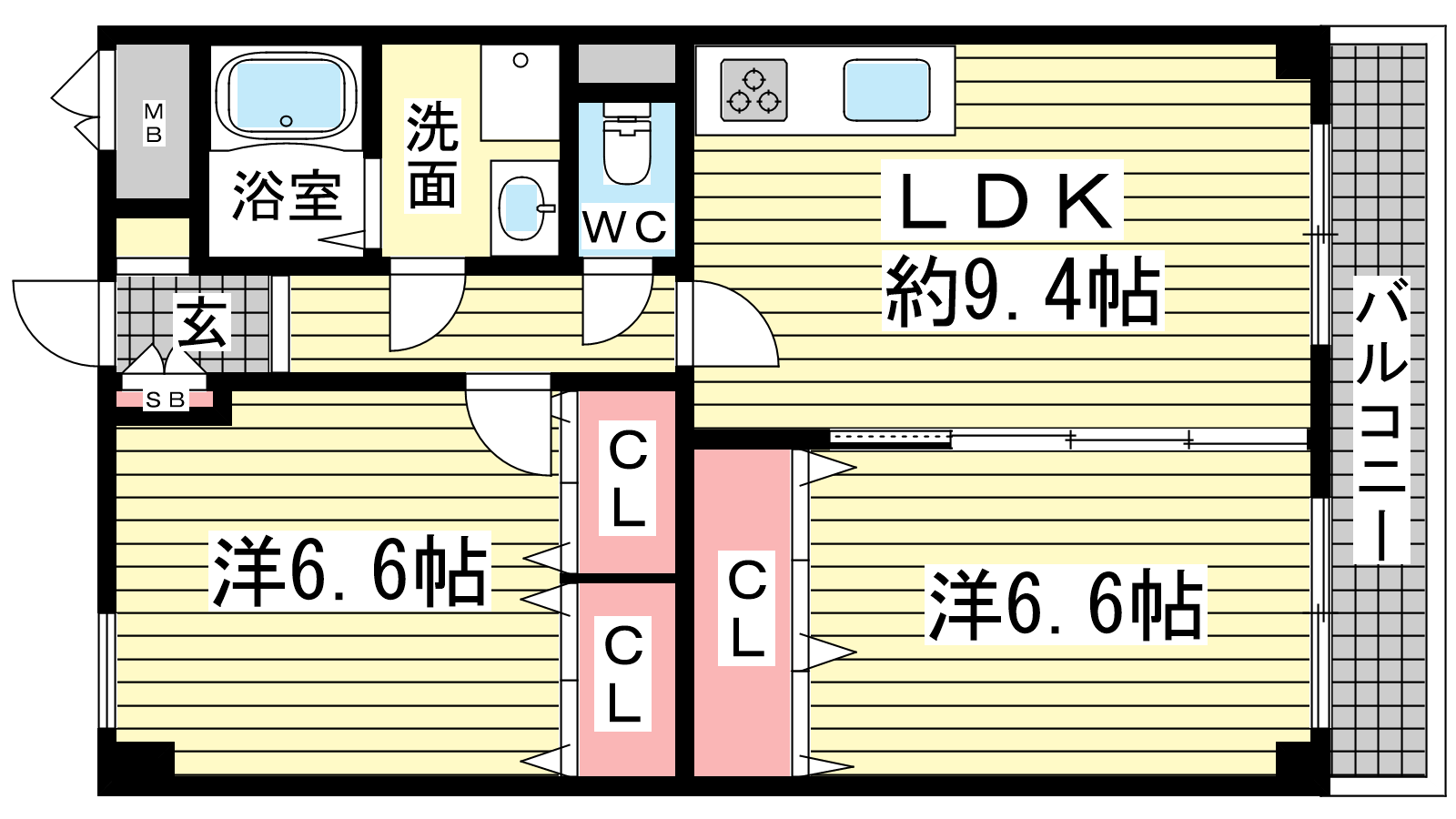 - LDK9.4帖、洋室6.6帖、洋室6.6帖