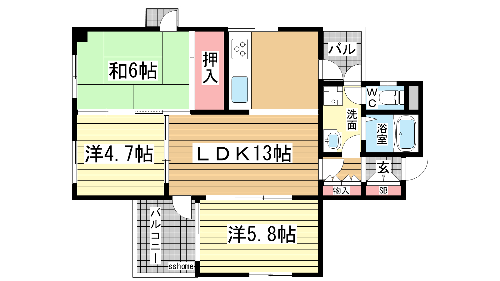 - LDK13帖、和室6帖、洋室5.8帖、洋室4.5帖