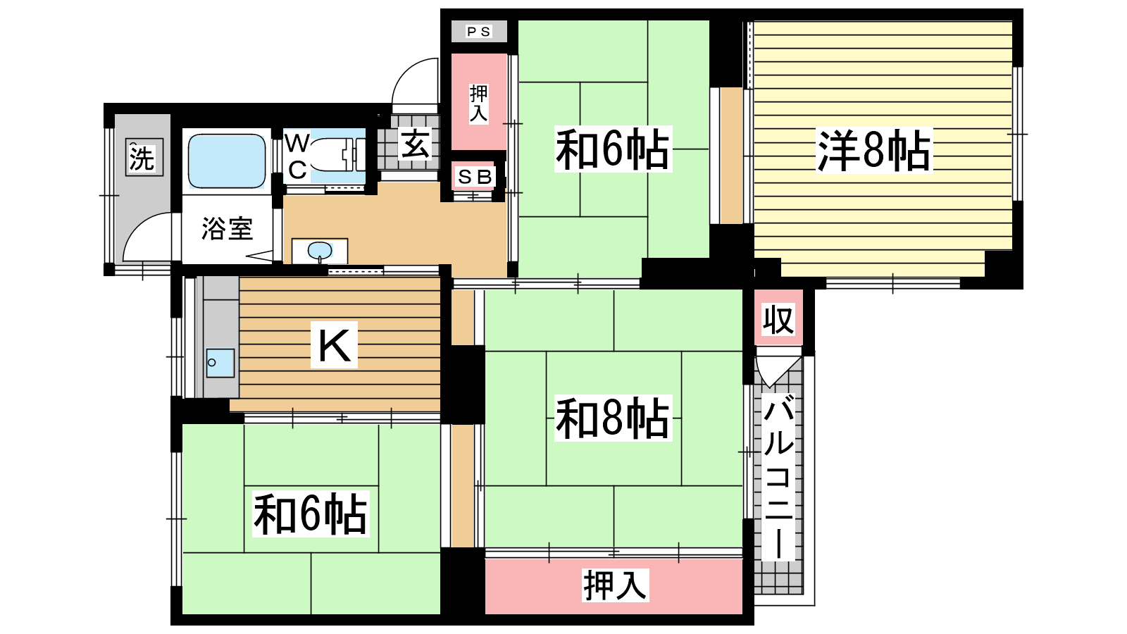 - K4帖、洋室8帖、和室8帖、和室6帖、和室6帖