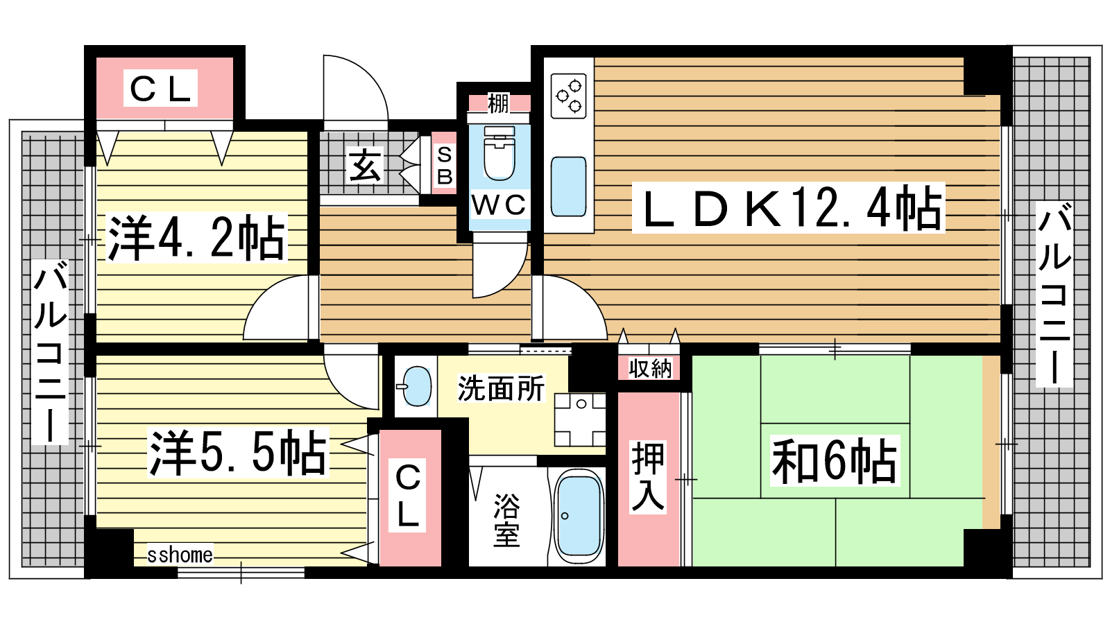 - LDK12.4帖、洋室5.5帖、洋室4.2帖、和室6帖