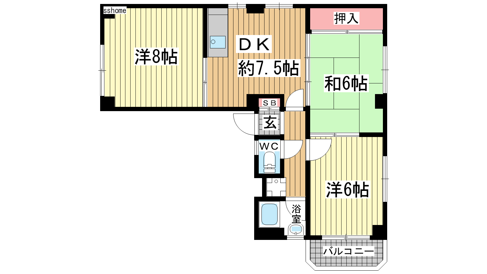 - DK7.5帖、和室6帖、洋室6帖、洋室8帖