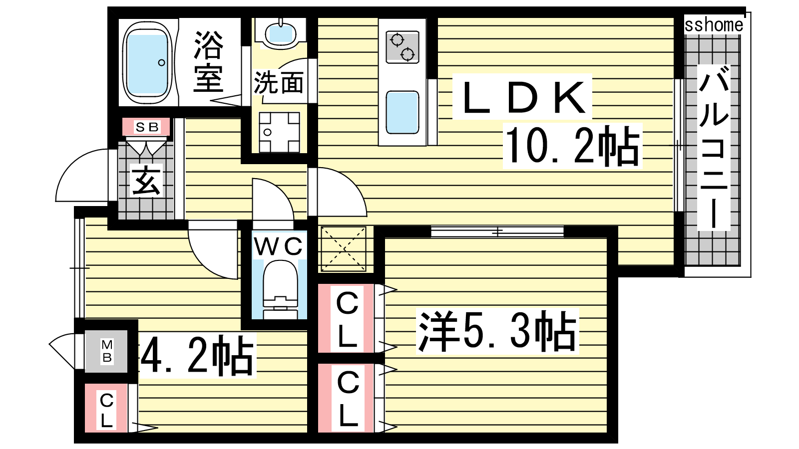 - LDK10.2帖、洋室5.3帖、S4.2帖