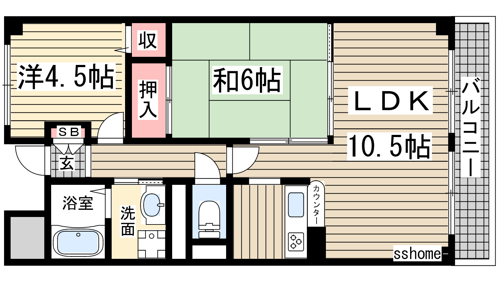 - LDK10.5帖、洋室4.5帖、和室6帖