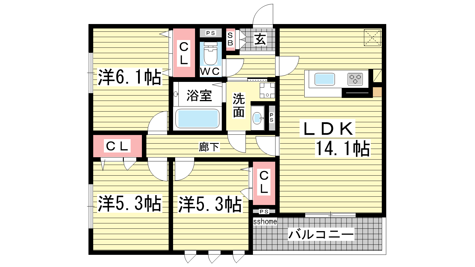 - LDK14.1帖、洋室6.1帖、洋室5.3帖、洋室5.3帖