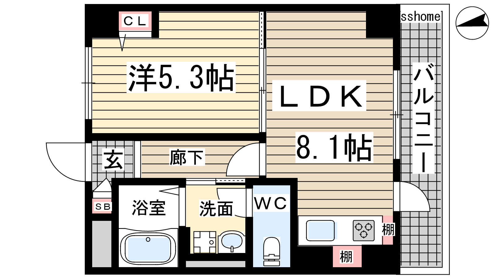 - 洋室5.3帖、LDK8.1帖