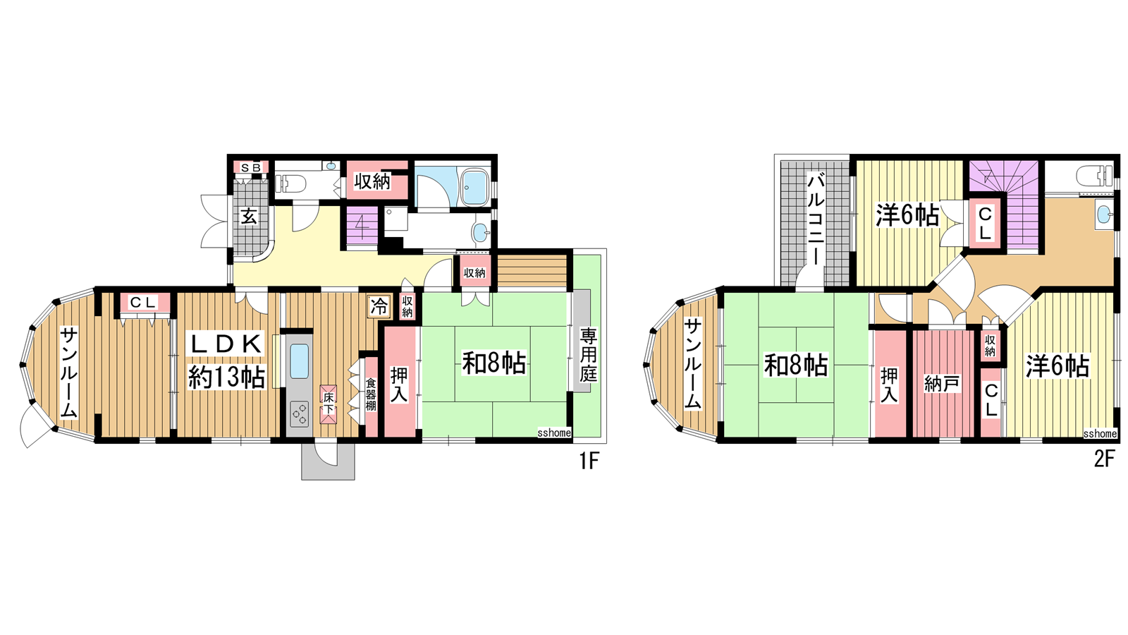 - 和室8帖、和室8帖、洋室6帖、洋室6帖、LDK13帖