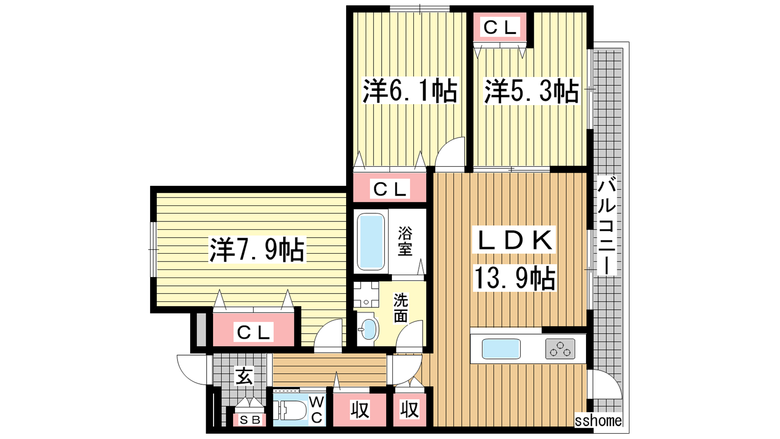 - LDK13.9帖、洋室7.9帖、洋室6.1帖、洋室5.3帖