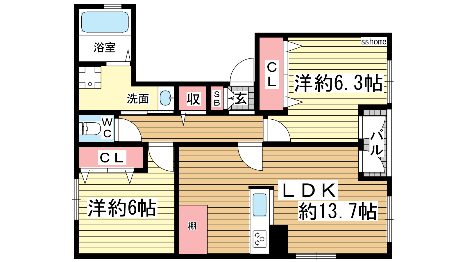 - LDK13.7帖、洋室6.3帖、洋室6帖