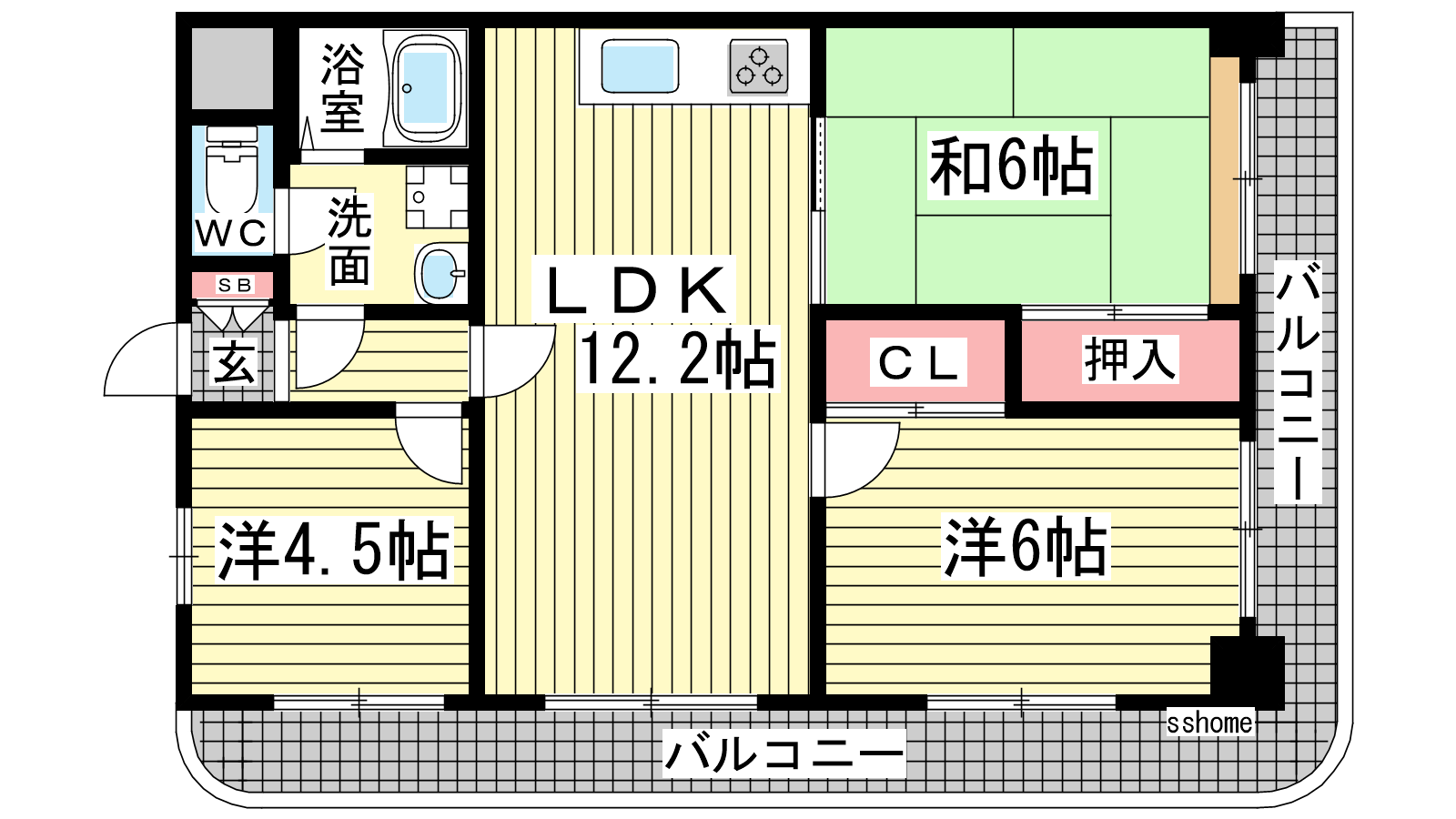 - LDK12.2帖、和室6帖、洋室6帖、洋室4.5帖