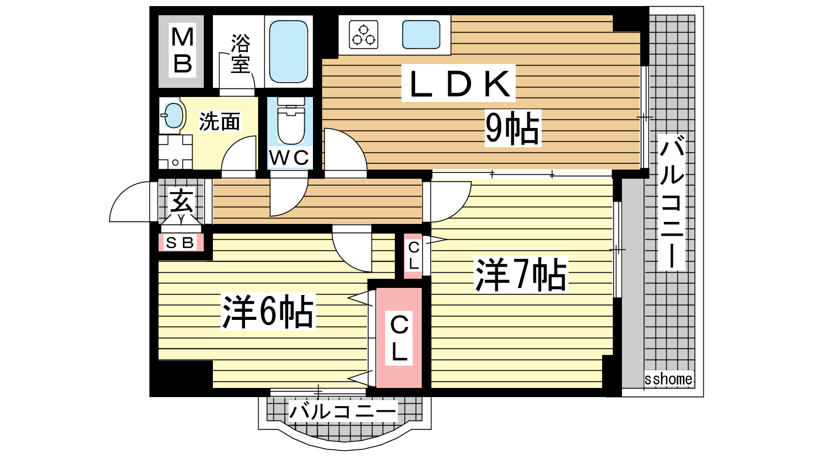 - LDK9帖、洋室7帖、洋室6帖