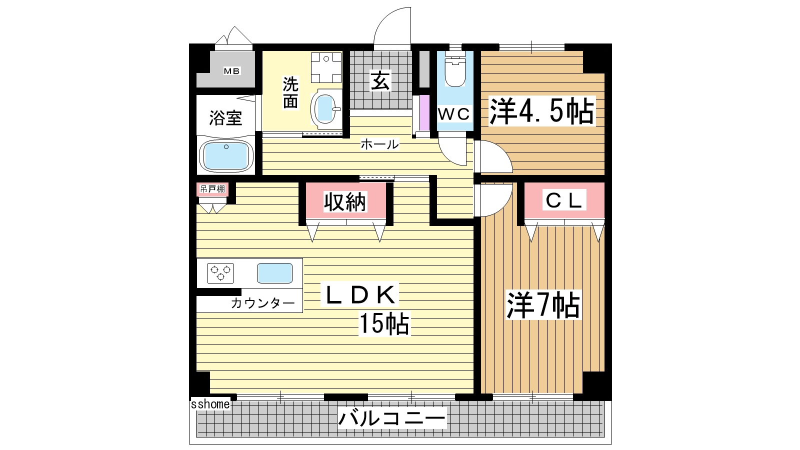 - LDK15帖、洋室7帖、洋室4.5帖