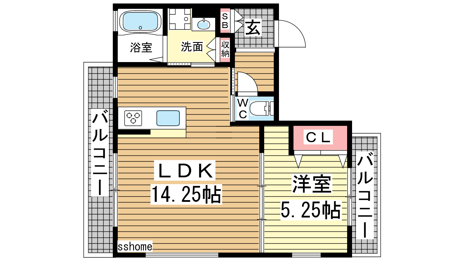 - 洋室5.25帖、LDK14.25帖