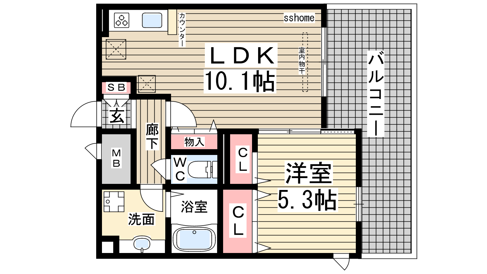 - 洋室5.3帖、LDK10.1帖