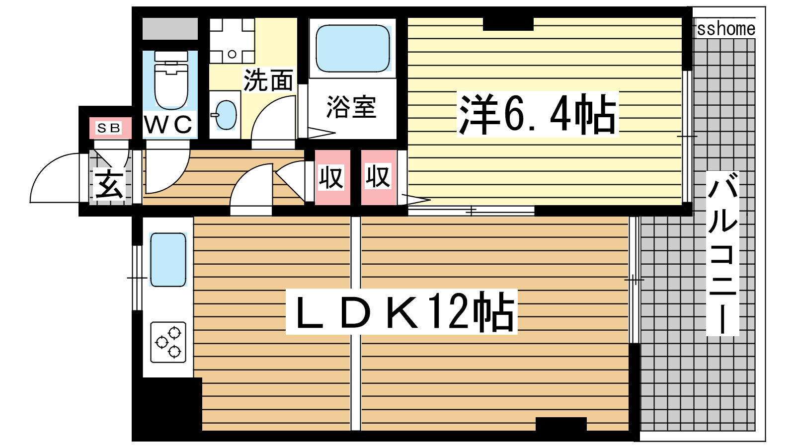 - LDK12帖、洋室6.4帖
