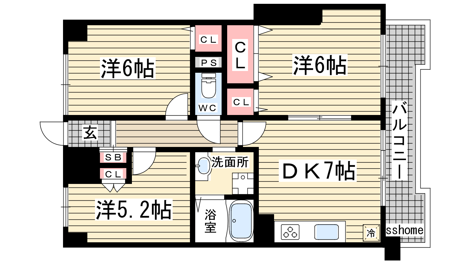 - DK7帖、洋室6帖、洋室6帖、洋室5.2帖
