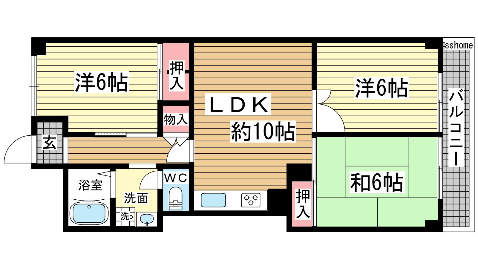 - LDK10帖、和室6帖、洋室6帖、洋室6帖