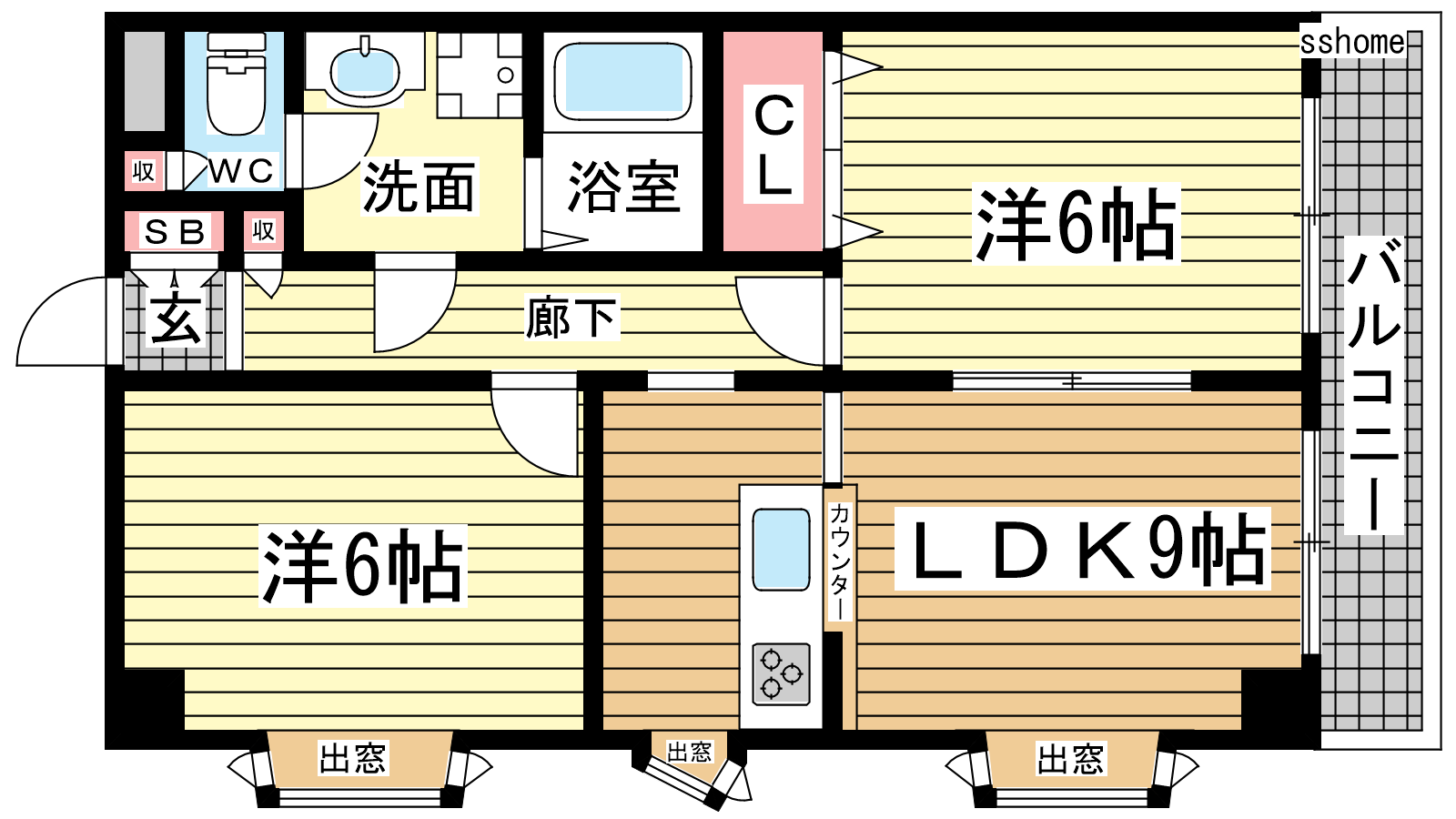 - LDK9帖、洋室6帖、洋室6帖