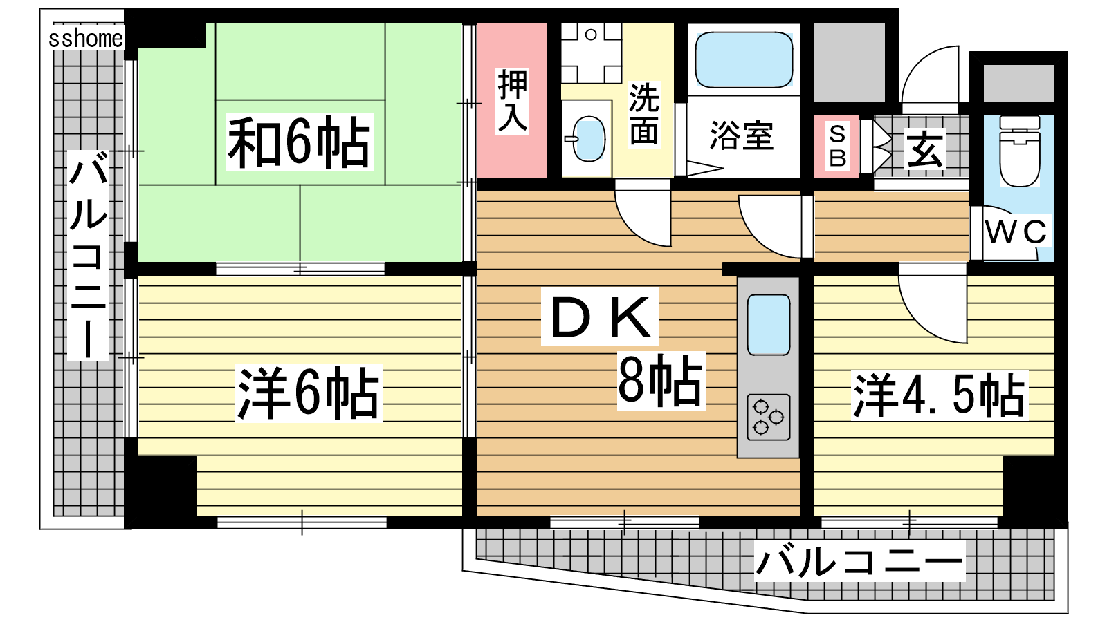 - DK8帖、洋室6帖、洋室4.5帖、和室6帖