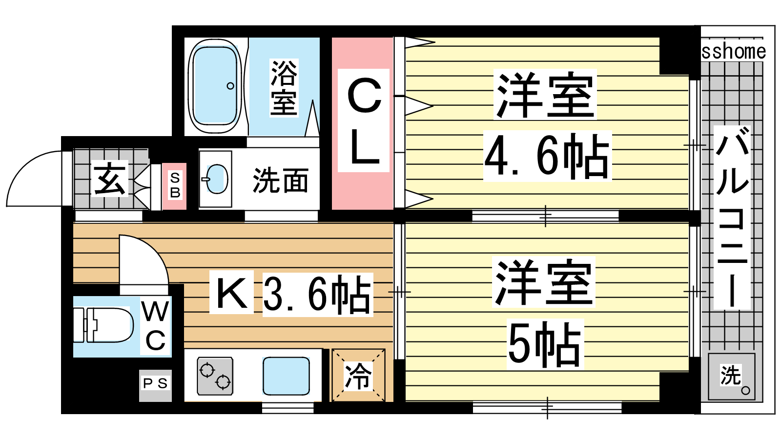- 洋室5帖、洋室4.6帖、K3.6帖