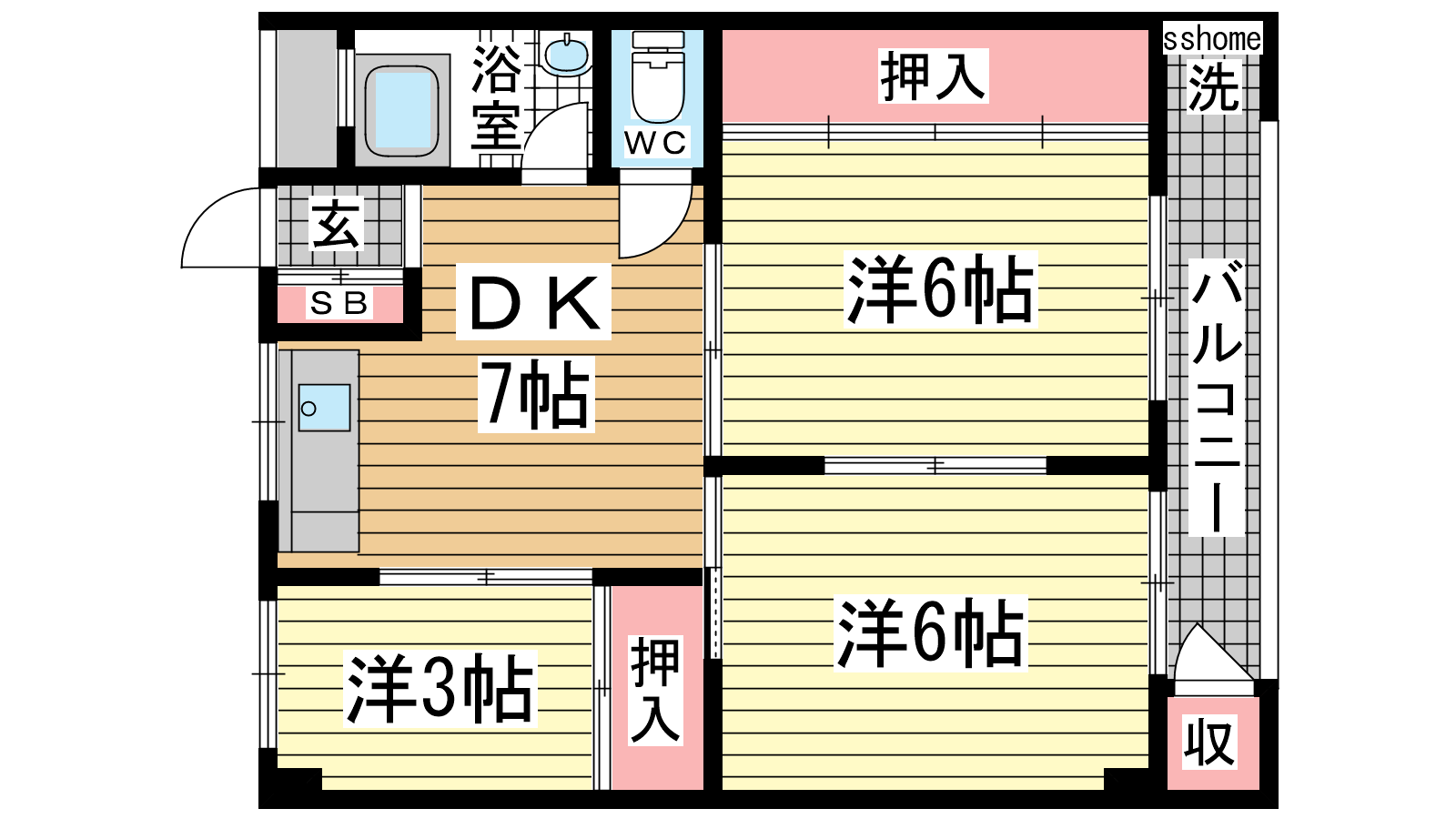 - DK7帖、洋室6帖、洋室6帖、洋室3帖