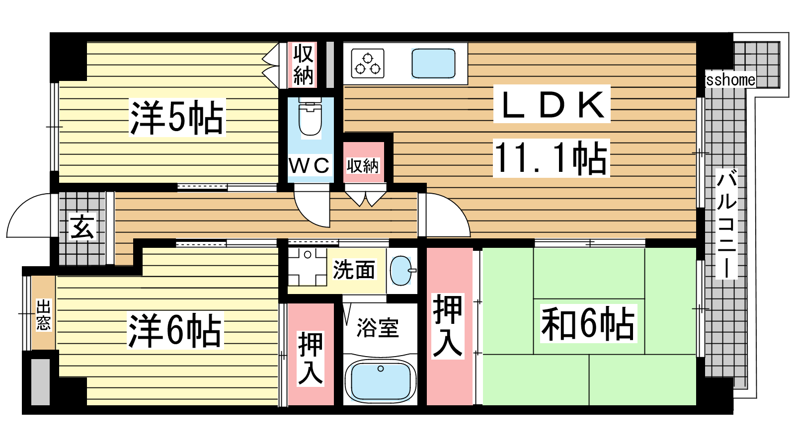 - LDK11.1帖、洋室6帖、洋室5帖、和室6帖