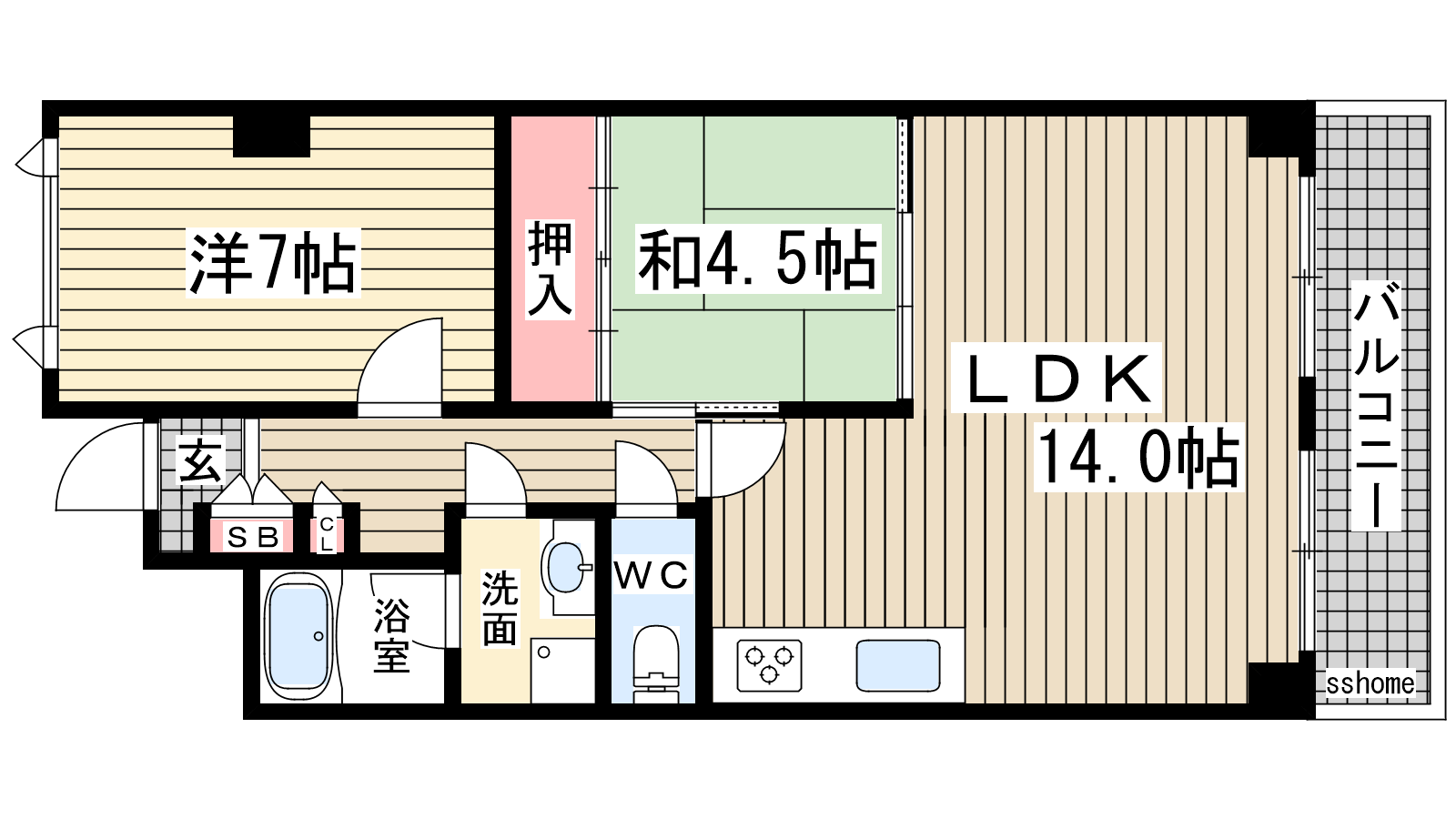 - LDK14帖、洋室7帖、和室4.5帖