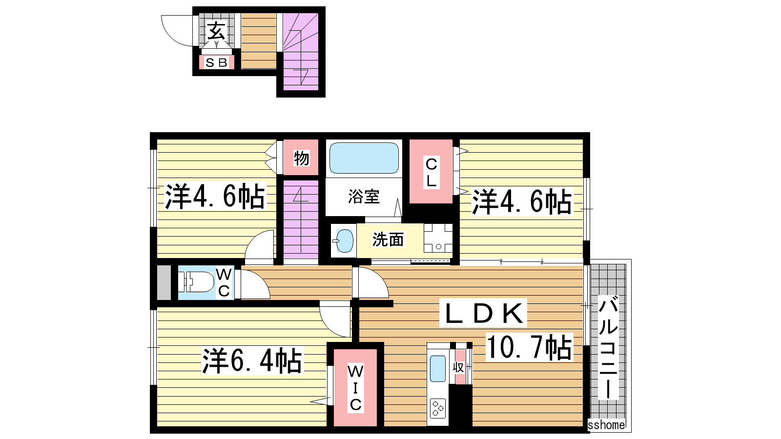 - LDK10.7帖、洋室6.4帖、洋室4.6帖、洋室4.6帖