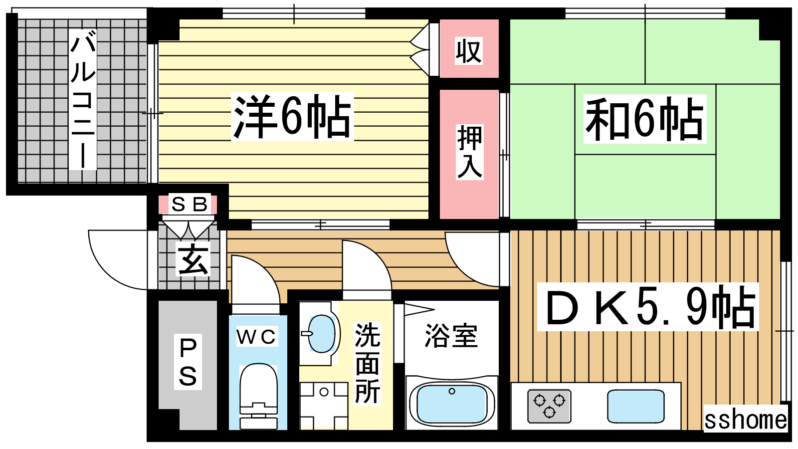 - DK5.9帖、和室6帖、洋室6帖