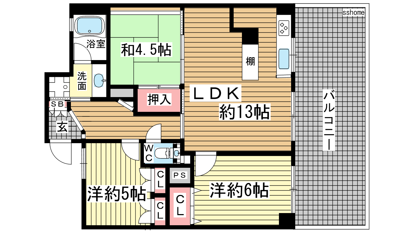 - LDK13帖、洋室6帖、洋室5帖、和室5帖